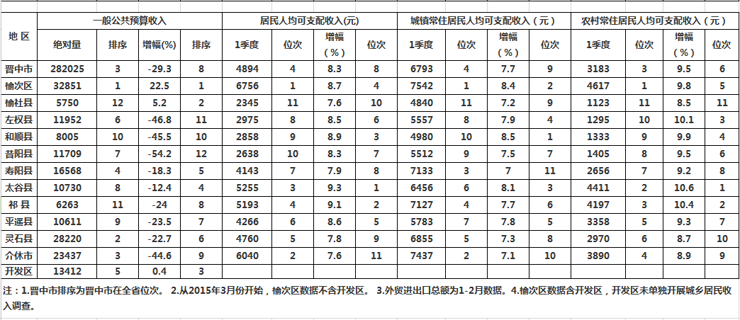 2015年1季度全市及分县(区、市)主要经济指标完成情况及排序