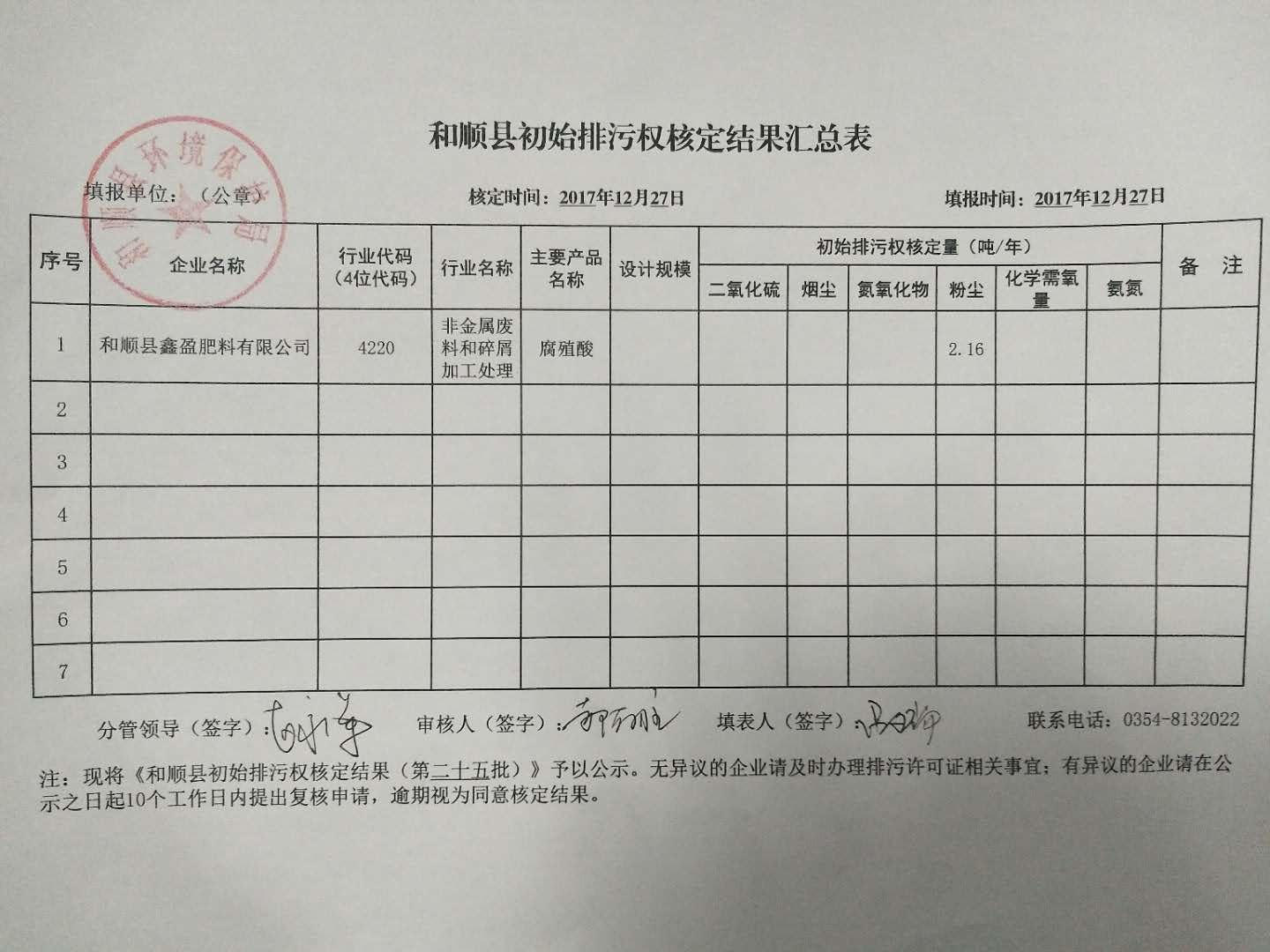 和顺县环境保护局对鑫盈肥料有限公司初始排污权的核定