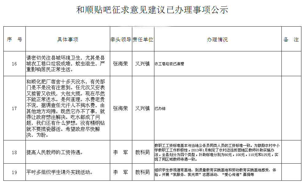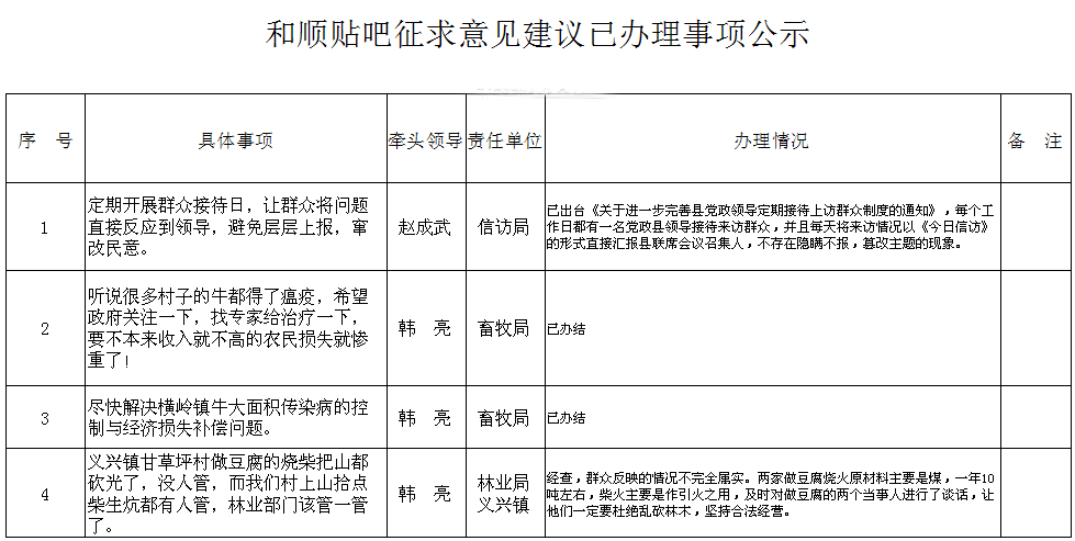 今年7月份以来,以民生改善为主题的第五次征求意见活动,得到了广大干部群众和网民朋友的热情参与,共从科级干部与和顺贴吧征求到涉及经济发展、农业农村工作、就业与社会保障、医疗卫生等13个方面1840余条意见和建议。经过一段时间的汇总、梳理、归类,我们把征集到的意见和建议逐项逐条分解到牵头领导和责任单位,并在今年9月份首次通过政府网站、和顺贴吧、政务微博等渠道,对第五次征求意见建议办理情况进行了公示。按照“一月一公示,一月一回复”的要求,在牵头领导和责任单位的共同努力下,我们再次把征求意见建议已办结事项进行公示,热诚接受大家的监督评议。