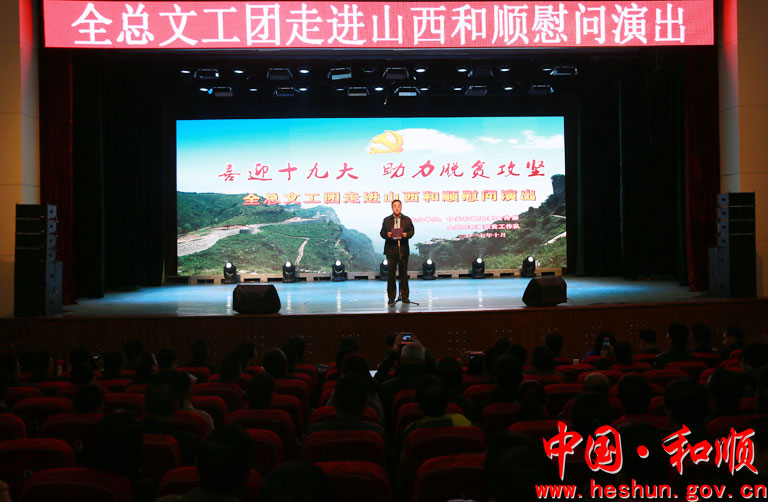 10月17日,中华全国总工会文工团到我县开展主题为“喜迎十九大,助力脱贫攻坚”的慰问演出。中华全国总工会宣传教育部副部长王舟波、劳动和经济部副部长刘晓延、全总文工团团长辛友谊等领导,县委书记孙永胜,县委副书记、政府县长马海军等县四大班子领导、其他县级领导,各乡镇党委书记、乡镇长、城区管委会主任、分管脱贫攻坚副职,县直各单位主要负责人,县扶贫开发中心班子成员、各股室负责人,贫困村驻村扶贫工作队队长、第一书记,所选派的挂职干部、村主干代表及帮扶企业代表观看慰问演出。