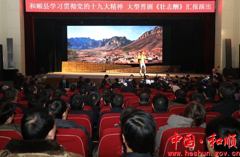 正值全县上下深入学习贯彻党的十九大精神热潮迭起,脱贫攻坚战役进入决胜阶段的关键时刻。12月24日晚,由中共和顺县委、和顺县人民政府主办,县委组织部、县委宣传部、县文旅委承办,县牛郎织女晋剧团演出的大型现代晋剧《壮志酬》在县文化中心举行首次汇报演出,市委常委、组织部长唐立浩,县四大班子领导、县直单位科级领导干部、奋战在脱贫攻坚一线的乡村两级党员干部共计700余人观看了演出。县委常委、宣传部长袁瑞军致词。