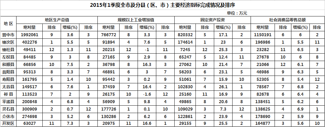 2015年1季度全市及分县(区、市)主要经济指标完成情况及排序