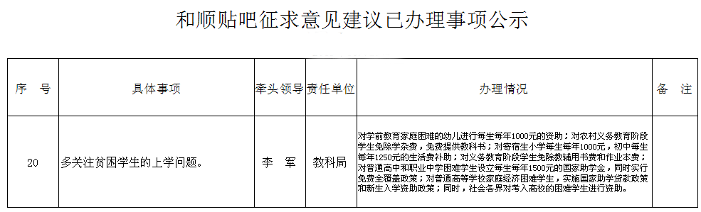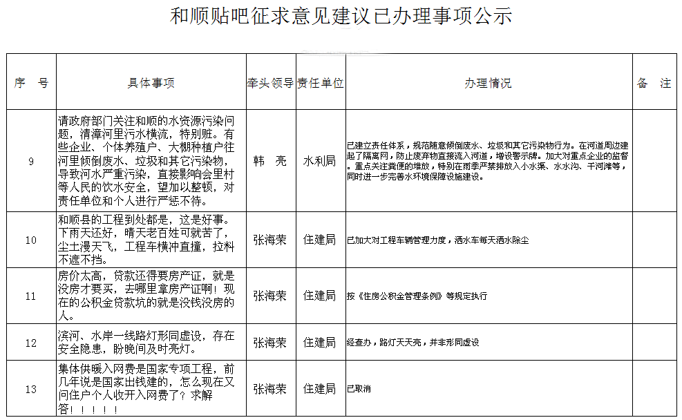 今年7月份以来,以民生改善为主题的第五次征求意见活动,得到了广大干部群众和网民朋友的热情参与,共从科级干部与和顺贴吧征求到涉及经济发展、农业农村工作、就业与社会保障、医疗卫生等13个方面1840余条意见和建议。经过一段时间的汇总、梳理、归类,我们把征集到的意见和建议逐项逐条分解到牵头领导和责任单位,并在今年9月份首次通过政府网站、和顺贴吧、政务微博等渠道,对第五次征求意见建议办理情况进行了公示。按照“一月一公示,一月一回复”的要求,在牵头领导和责任单位的共同努力下,我们再次把征求意见建议已办结事项进行公示,热诚接受大家的监督评议。